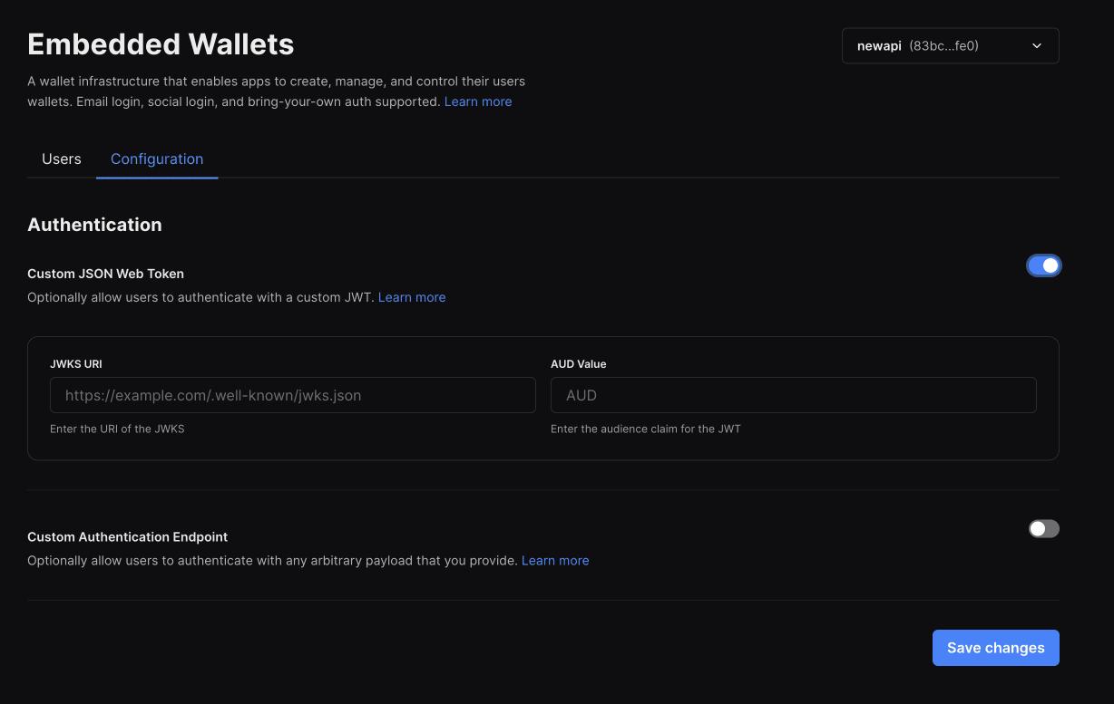 To setup an OIDC compatible auth, enable the first option in the configuration tab of the in-app wallet dashboard